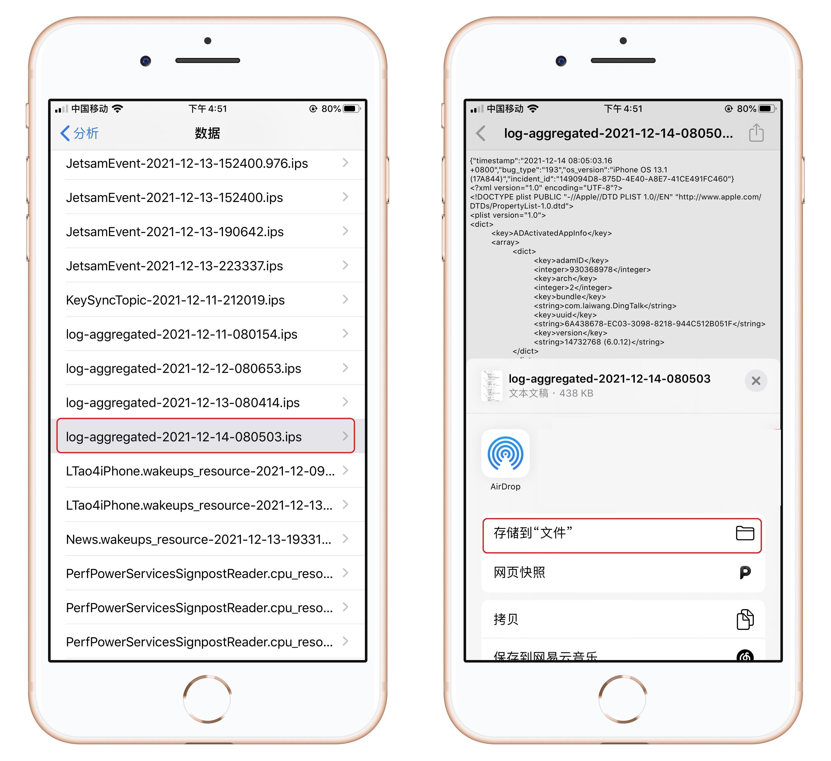接着我们查看分析数据,找到“log”开头的串号,它有时间记录的,选择最新的日期,打开后点击右上角的“分享”按钮,选择【储存到文件】。