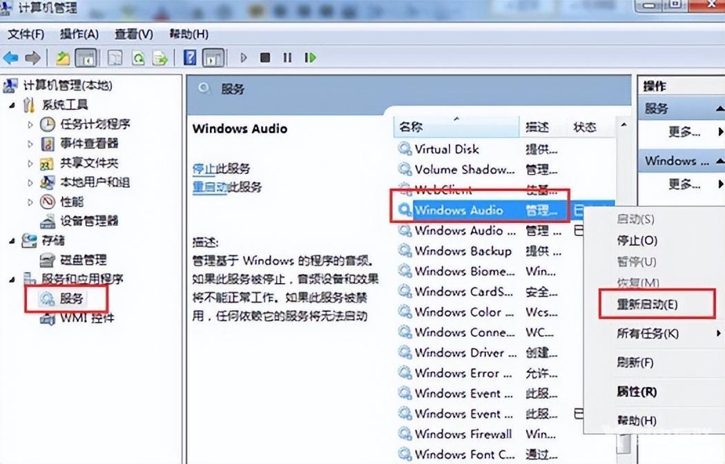 3、双击服务选项,找到“windows audio”选项,点击右键选择重新启动,如下图所示: