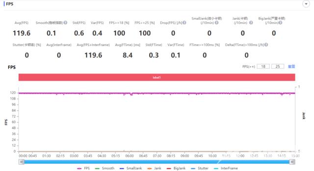 随后,我们在《王者荣耀》高清画质全开+120帧模式下进行了对战测试。vivo S15的15分钟平均帧率为119.6帧,游戏全程帧率表现非常稳定,没有出现掉帧和卡顿的情况,即使是团战时的帧率也十分稳定。