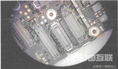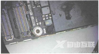 经测量闪光灯供电芯片U1602的工作电压正常,通过分析U1602电路图得知闪光灯供电芯片U1602工作需要通过I²C总线控制。直接拆掉闪光灯供电芯片U1602之后测量E2脚、D2脚I²C总线焊盘对地三极体值,发现E2与D2脚对地二极体值无穷大,说明闪光灯供电芯片的I'C总线断线。此总线还连接到后置摄像头座子,在后置摄像头座子测量对地二极体值为正常值,判断闪光灯供电芯片U1602焊盘的板层断线,接从后置摄像头连接座飞线到闪光灯供电芯片U1602焊盘上,再将U1602芯片装上,如图所示。