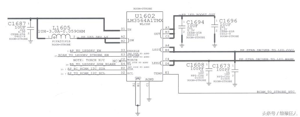 此类故障一般是因为闪光灯损坏导致摄像头不能使用,所以直接检修闪光灯。先要测量闪光灯供电是否正常。查电路图找到闪光灯供电由U1602输出,如图所示。U1602实物位置如图所示。