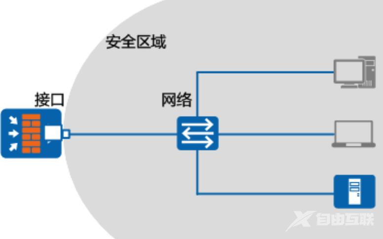 接口加入安全区域代表接口所连接的网络加入安全区域,而不是指接口本身。接口、网络和安全区域的关系如图1.2所示。