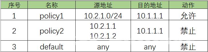 企业的一台服务器地址为10.1.1.1,允许IP网段为10.2.1.0/24的办公区访问此服务器,配置了安全策略policy1。运行一段时间后,又要求禁止两台临时办公PC(10.2.1.1、10.2.1.2)访问服务器。