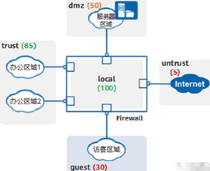 防火墙的安全区域按照安全级别的不同从1到100划分安全级别,数字越大表示安全级别越高。防火墙缺省存在trust、dmz、untrust和local四个安全区域,管理员还可以自定义安全区域实现更细粒度的控制。例如,一个企业按图1-3划分防火墙的安全区域,内网接口加入trust安全区域,外网接口加入untrust安全区域,服务器区接口加入dmz安全区域,另外为访客区自定义名称为guest的安全区域。