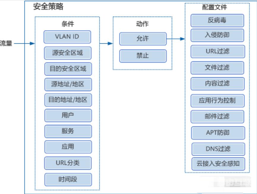 如图1-4所示,安全策略由匹配条件、动作和内容安全配置文件组成,针对允许通过的流量可以进一步做反病毒、入侵防御等内容安全检测。