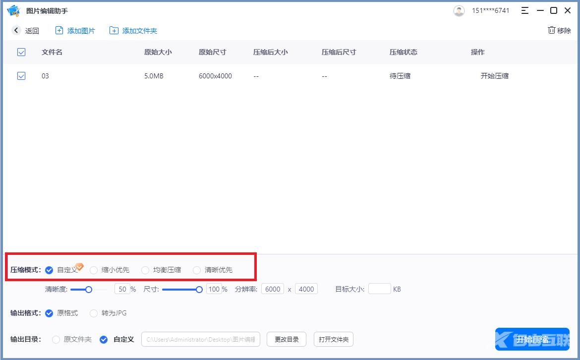 它支持四种压缩模式,其中自定义模式可以自由调节清晰度、尺寸、分辨率以及目标大小,并且可以设置图片的输出格式,选择输出目录之后点击【开始压缩】就可以了。