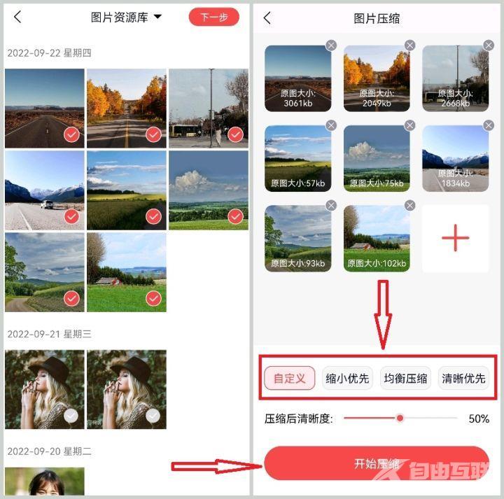 点击之后可以将需要压缩的照片导入,它一次性最多可以导入9张照片批量压缩,支持四种压缩模式:自定义模式、缩小优先、均衡优先、清晰优先,自定义模式可以自己设置压缩率。