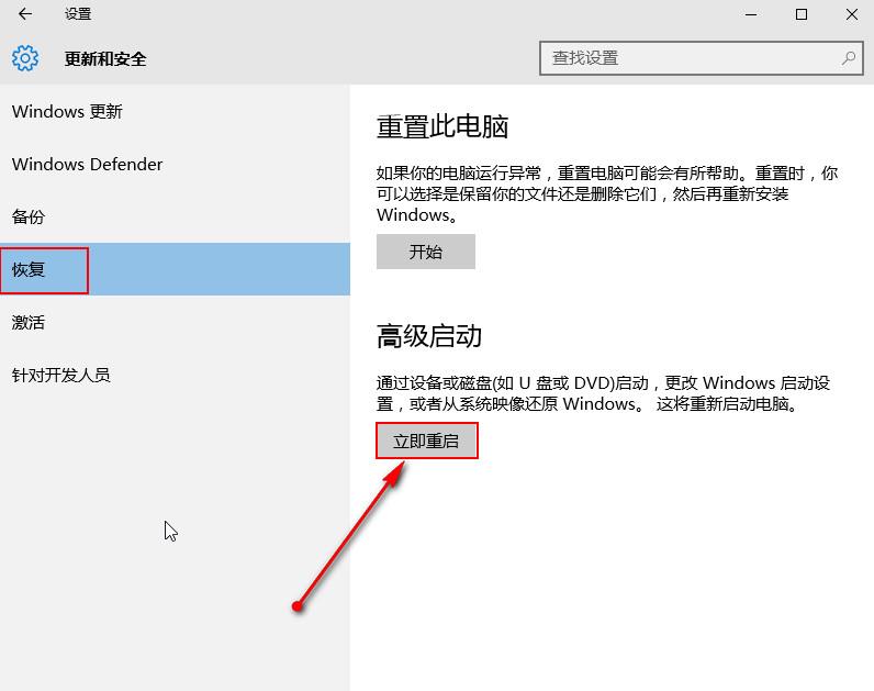 3、点击“恢复”选项,选择“立即重启”,如下图所示:
