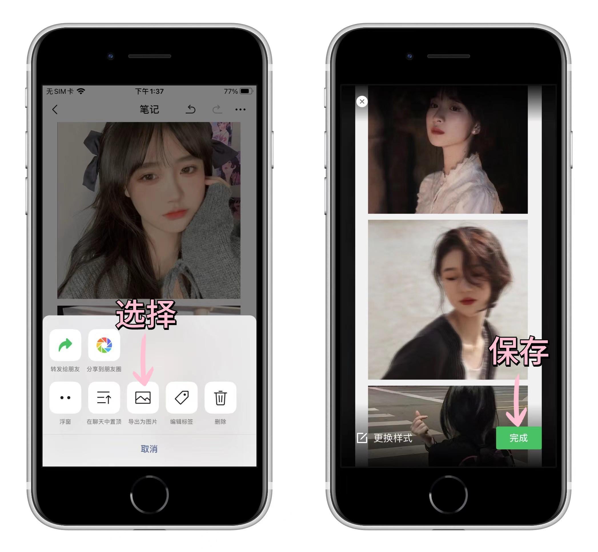 当图片添加到笔记中后,点击右上角的“···”,选择【导出为图片】,1秒即可生成长图,点击【完成】,保存长截图到相册。