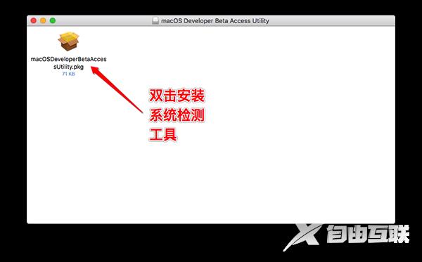 1、下载完整的macOS 11.0公测版升级工具.dmg的文件,打开文件,双击.pkg安装包运行即可检测到最新的macOS 11.0测试版系统升级信息。