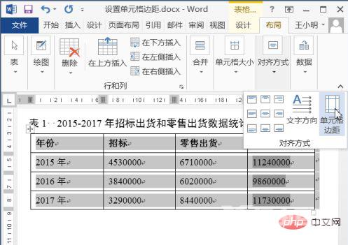 选中表格在“表格工具”栏中,单击“布局”选项卡;?单击“对齐方式”组中的“单元格边距”按钮