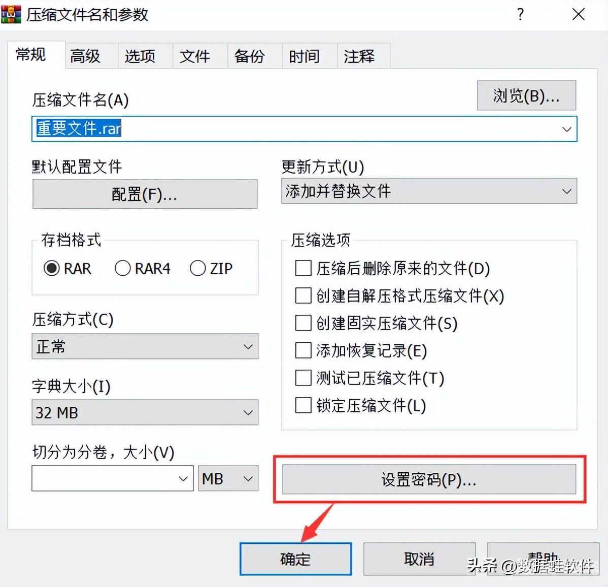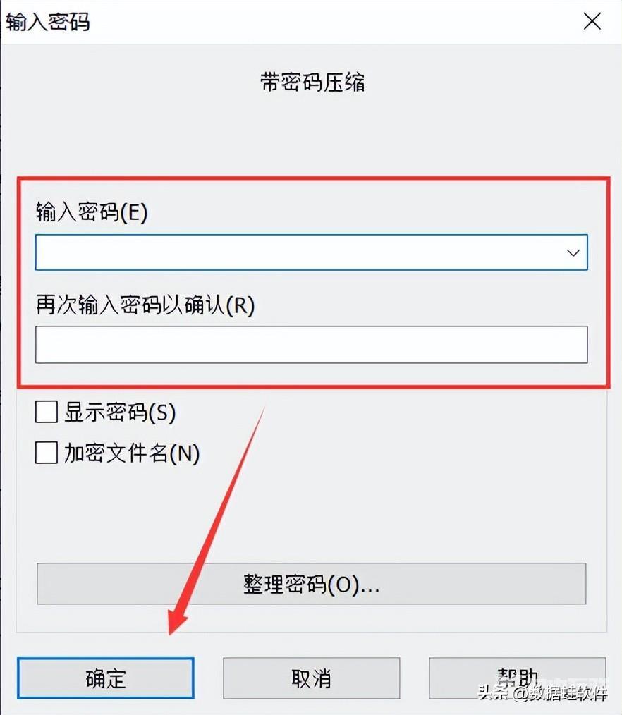 3. 在弹出的窗口输入你要设置的密码,并再次输入密码以确认,最后选择“确定”。设置好后,你就会看到一个加密并压缩的文件夹,可以双击打开,把压缩包解压出来就可以了。