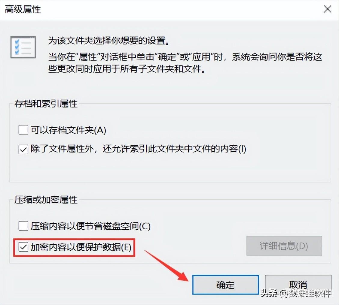 3. 之后就会继续弹出一个窗口,在压缩或加密属性下,选择“加密内容以便保护数据”即可。