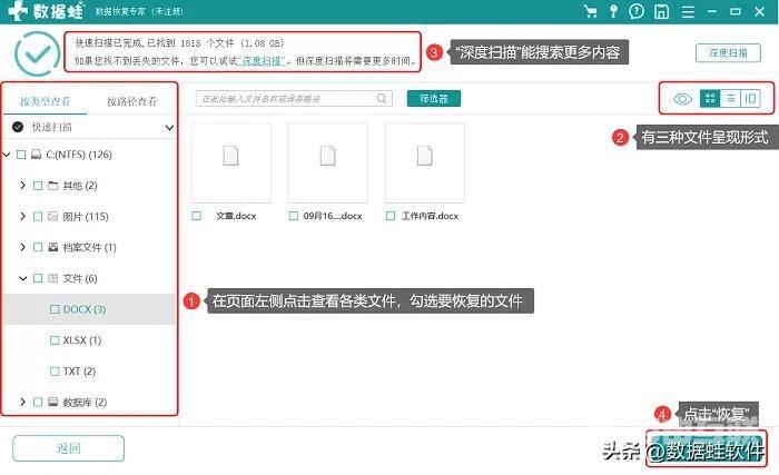 2. 扫描结束后,在页面左侧点击查看各类文件,勾选要恢复的文件。页面右上角有三种文件呈现形式,可以通过切换视图来查看相关文件。最后点击“恢复”。如果快速扫描里面没有你要恢复的文件,就选择“深度扫描”搜索更多内容。