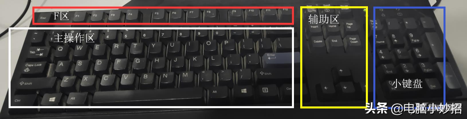 我们可以简单的把电脑键盘分作5个区域,简单的分为左中右的结构,在左面和右面又分为上下结构。