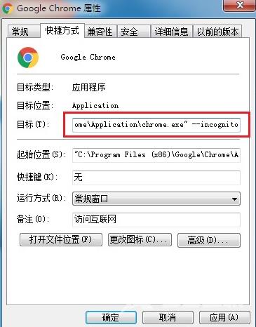2、此时会弹出谷歌浏览器的属性窗口,并且此时默认是在“快捷方式”选项卡中,我们在目标一栏的末尾处加一个空格,然后输入“--incognito”(如图所示)。