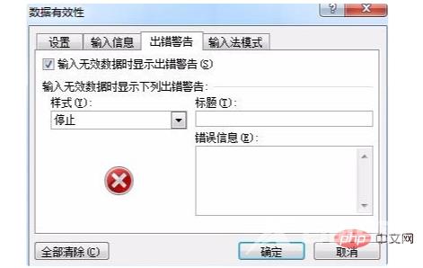 5、也可以在“出错警告”选项中设置警告样式及标题,如图: