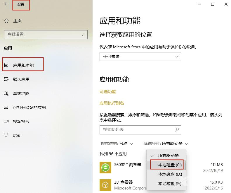 打开【设置】,选择【应用】,在【筛选条件】这里选择【C盘】,如果带有第三方软件,可以在这里直接卸载,重新安装到其它硬盘里,在安装的时候点击【自定义安装】就可以了。