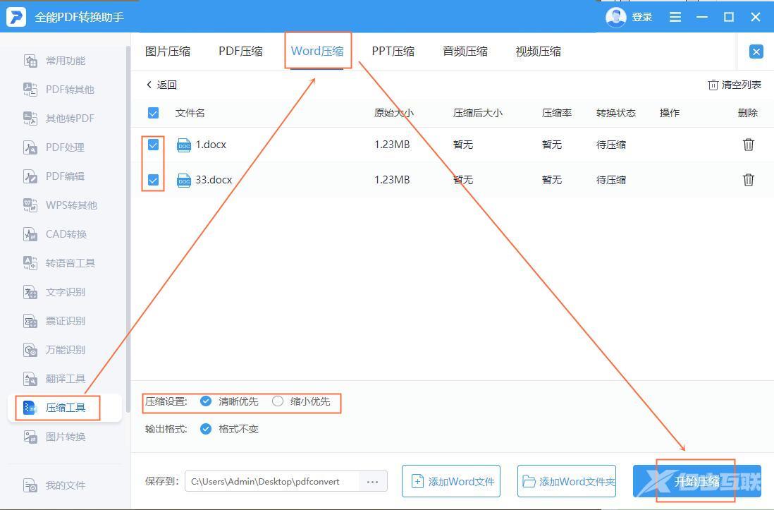 打开软件,选择【压缩工具】,根据文件类型选择,以文档压缩为例,点击【Word压缩】,修改压缩设置,然后点击【开始压缩】就可以了。