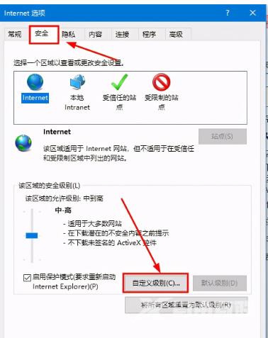 3、点击“安全”标签,选择“自定义级别”,如图所示。