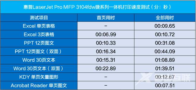 下面我们就开始对惠普3104fdw一体机进行输出速度的测试,在输出速度测试方面我们共分为打印、扫描以及复印三个部分,需要说明的是整个测试过程我们采用PC端USB连接的方式进行测试,这样可以最大程度减少因网络延迟因素造成的误差,并且输出速度是从电脑端发出指令开始计算,详细测试结果如下: