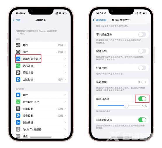 但如果你对上述两种方式都不是很喜欢的话,你可以使用降低白点值,开启方式很简单,设置<辅助使用<显示与文字大小<降低白点值,拉动滑块选择适合当前使用场景的数值就可以了。