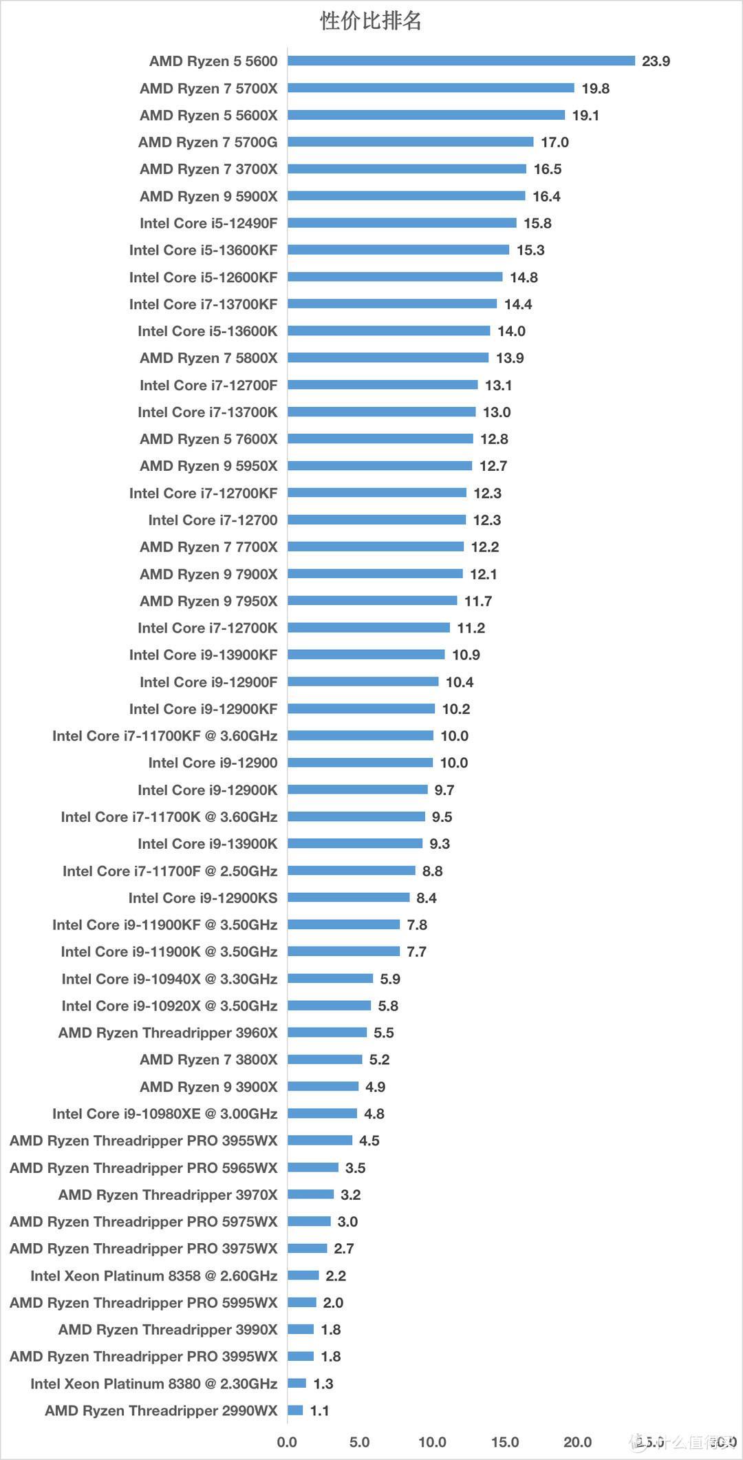 先放结论:性价比排名前6的CPU都是AMD的,其中排名最高的是AMD Ryzen 5 5600(AMD 5500可能性价比更高,但是5500的cpubenchmark跑分在2万分以下,所以我没有统计,有兴趣的朋友可以自行计算)。所以大家知道AMD的股票为什么一直涨,Intel的股票一直跌了吧?最新数据:Intel总市值为1480亿美元,而AMD为1530亿美元。Intel性价比最高的CPU是i5-12490F,其次是i5-13600KF(Intel的13代最新款)。AMD上个月发布的最新的Ryzen 5 7600X等“7”开头的CPU,因为刚出,性价比不高。