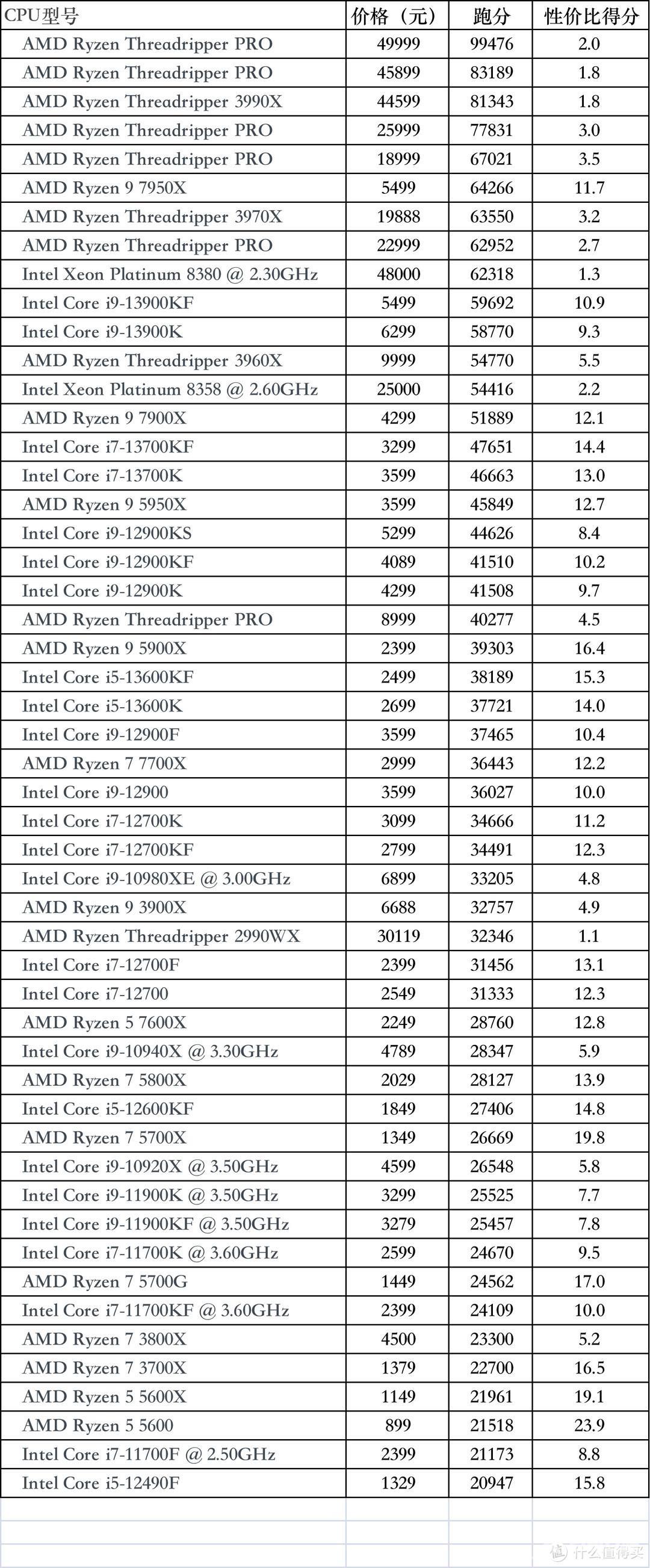 说明:CPU价格是2022年10月29日在京东商城找到的最低价格(部分价格是双十一预售价),你看到本文的时候,不一定是这个价格。CPU跑分是cpubenchmark网站的跑分。性价比得分是用cpubenchmark跑分除以价格,获得每一元可以买到的跑分。