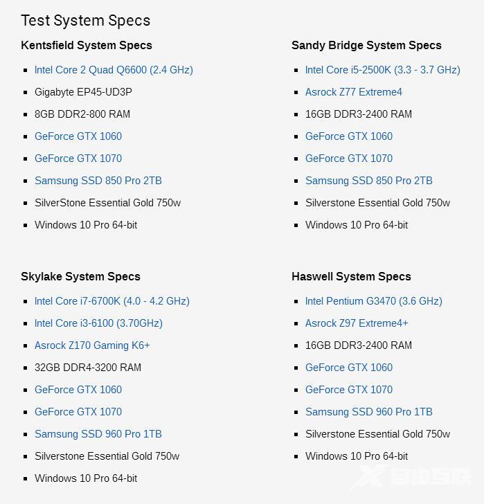 为了做这个测试,他们搭建了四套平套,除了Q6600+P45+DDR2之外,还有SNB架构的Core i5-2500K+Z77+DDR3、Haswell时代的奔腾G3470+Z97+DDR3及Skylake时代的Core i7-6700K、i3-6100+Z170+DDR4,详细配置如下: