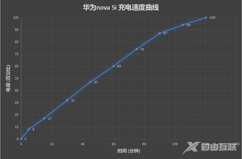 华为nova 5i的电池容量为4000mAh,充电功率为10W,在大电池小功率的情况下,最终从0%冲至100%用时120分钟。