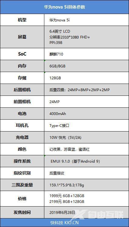 此外,华为nova 5i还配备有4000mAh电池,机身运行基于Android 9.0的EMUI 9.1定制系统,提供全新GPU Turbo、小艺语音助手等特色功能。