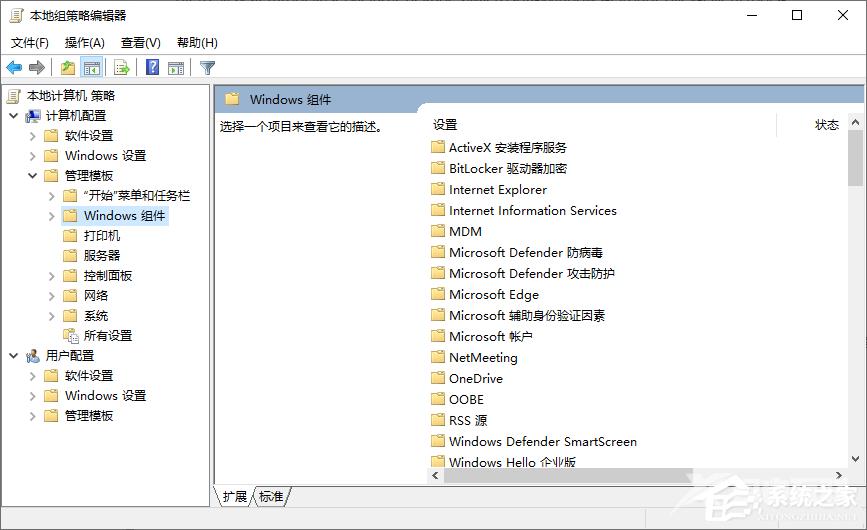 找到Windows组件,右侧找到资讯和兴趣,双击打开;