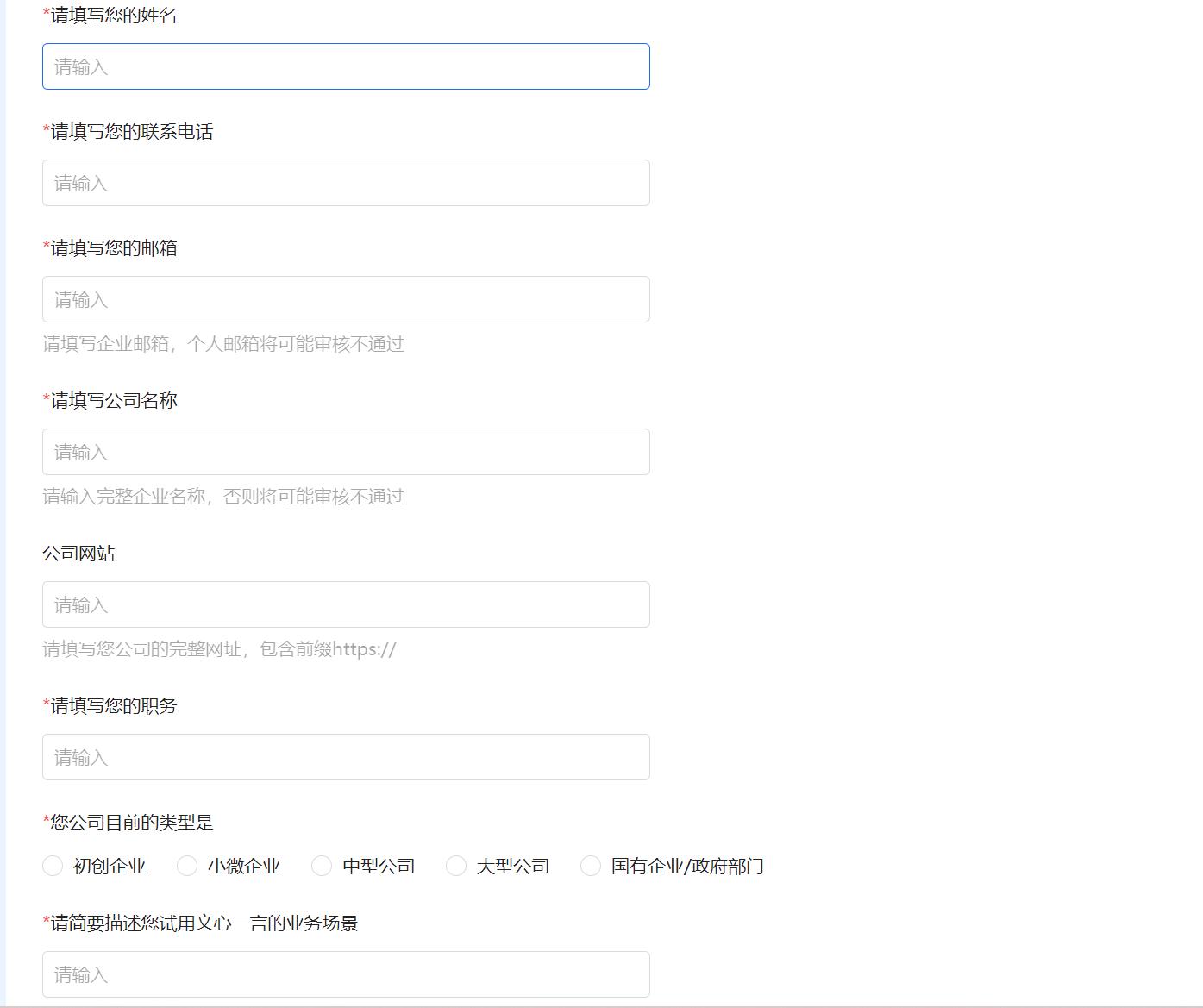 2、填写姓名、联系方式、邮箱、公司名称、职务、企业类型、试用文心一言的业务场景等信息。