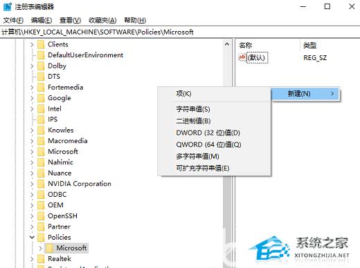4、右键点击Microsoft注册表项,在弹出菜单中依次点击“新建/项”菜单项。