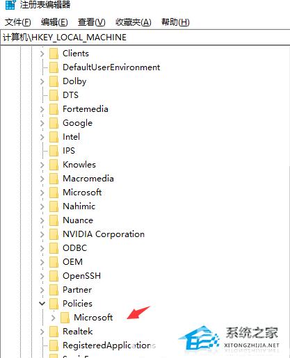 3、然后在打开的注册表编辑器窗口中定位到”HKEY_LOCAL_MACHINE\SOFTWARE\Policies\Microsoft“注册表项。