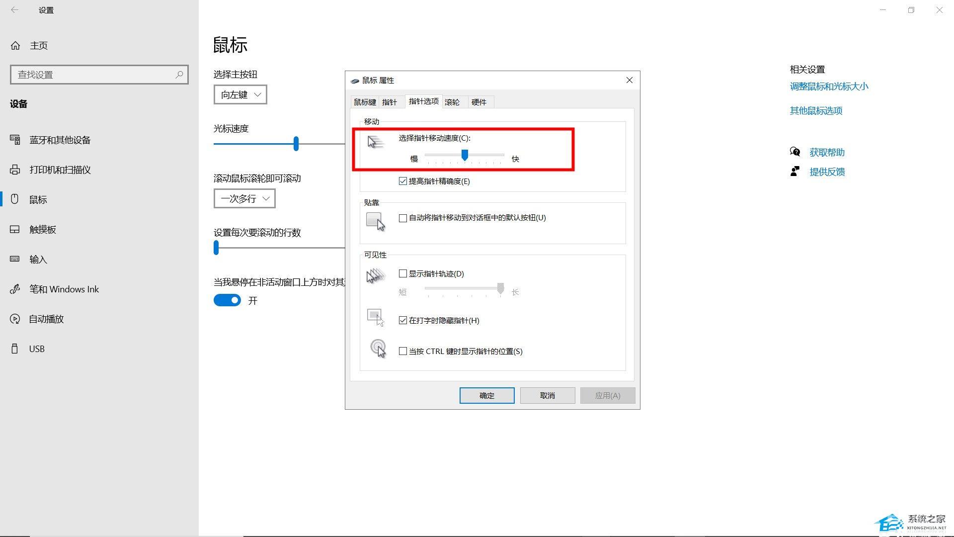 5、进入鼠标属性,点击指针选项栏,可通过调整“选择鼠标移动速度”下方滑块来设置鼠标灵敏度。