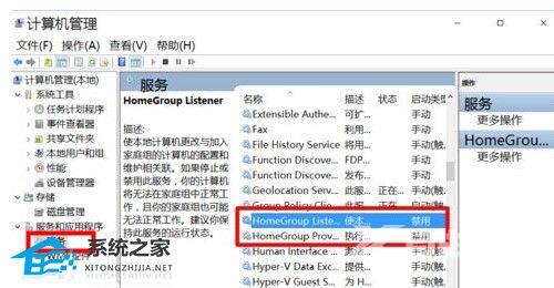 2、左侧的菜单选择服务——在右侧找到“HomeGroup Listener”和“HomeGroup Provider”两个服务。