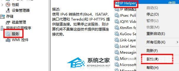 1、右键点击此电脑——选择管理——在左侧菜单选择服务——右侧找到IPHelper——右击选择属性。