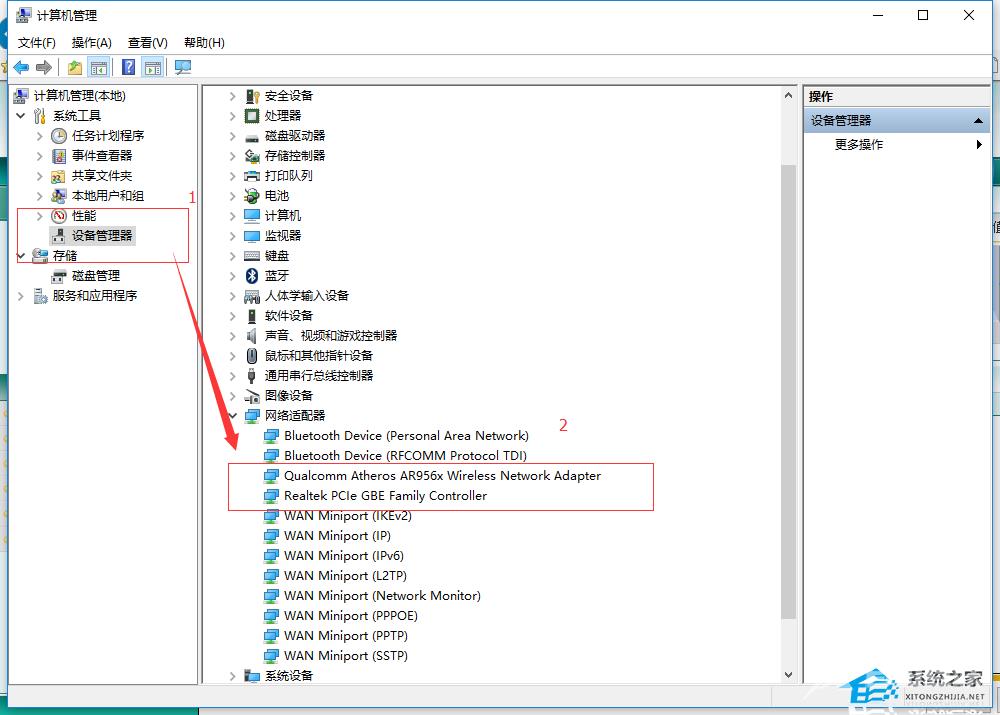 3、找到网络适配器一项,展开折叠菜单后,找到网卡的驱动并鼠标右键选择【属性】。