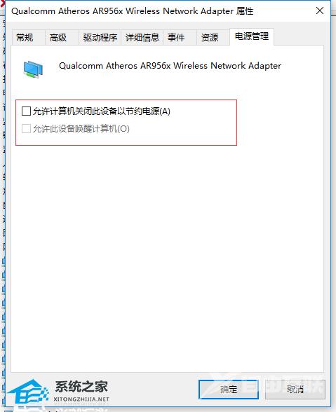 4、在打开的电源管理窗口中,把【允许计算机关闭此设备以节约电源】前的复选框的勾选去掉。