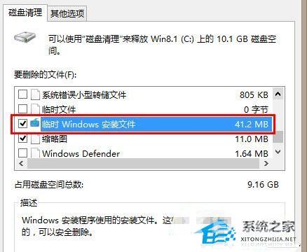 2、打开磁盘清理后,单击“清理系统文件”,然后在扫描后勾选Windows临时安装文件并确定;