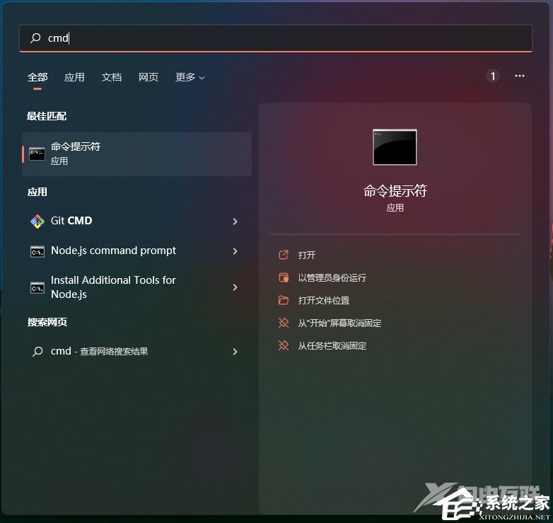步骤1、按【 Win + S 】输入cmd,并以管理员身份打开命令提示符;