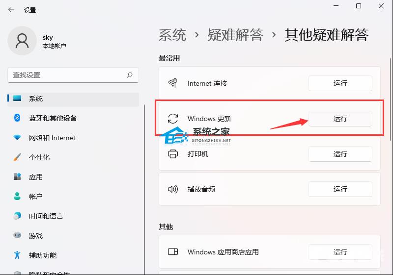 4、当前路径为:系统>疑难解答>其他疑难解答,最常用下,点击Windows 更新旁边的【运行】;