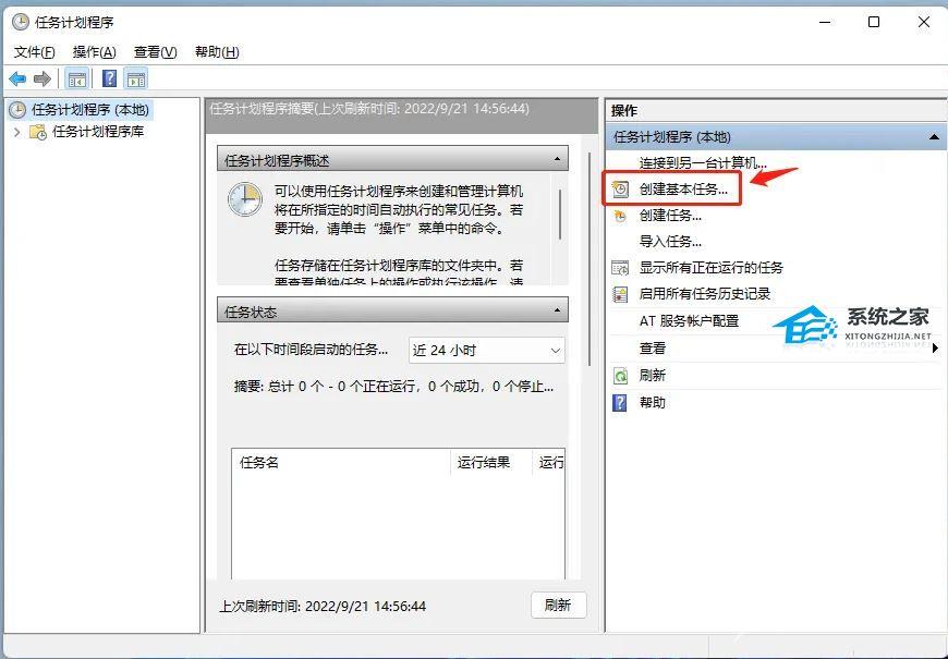3、在打开的”任务计划程序“窗口中,点击“创建基本任务”。