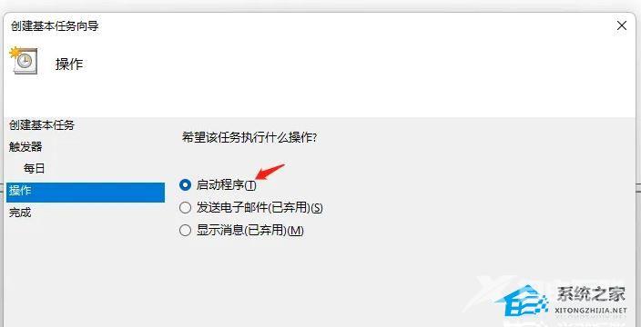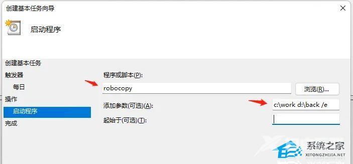 8、在“程序”栏中输入:robocopy,在“添加参数”栏输入:c:\work d:\back /e,意思就是通过robocopy命令将c盘work文件夹备份到d:\back文件夹下,/e的参数是表示复制所有文件夹,包含空文件夹。点击“下一页”。
