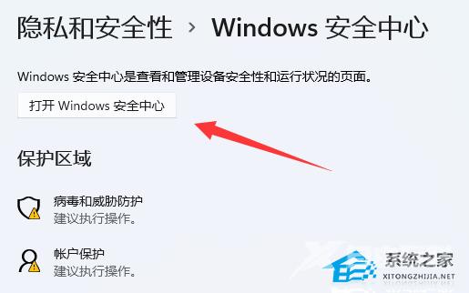 5、进入后选择“打开windows安全中心”就是win11自带的杀毒软件了。
