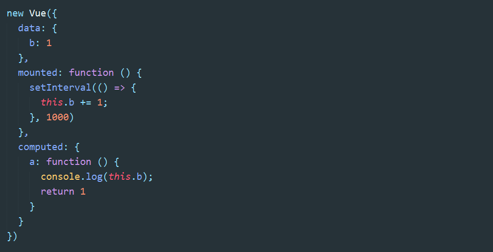 上述代码会源源不断的打印出 b 的值。如果希望 a 依赖 data 中的 x 而变化,只需保证 a 函数中有 this.x 即可。如果函数中没有出现 data 中的属性,那么无论 data 中的属性怎么变,a 对应的函数一次也不会执行。
