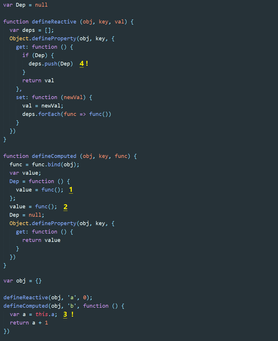 3. b 的 get 函数会添加 b 属性的依赖项,而刚才在处理计算属性过程中,a 已经作为依赖项被传给了一个全局变量,b 的 get 函数会检测到这个全局变量,并将其添加到自身的订阅者列表中